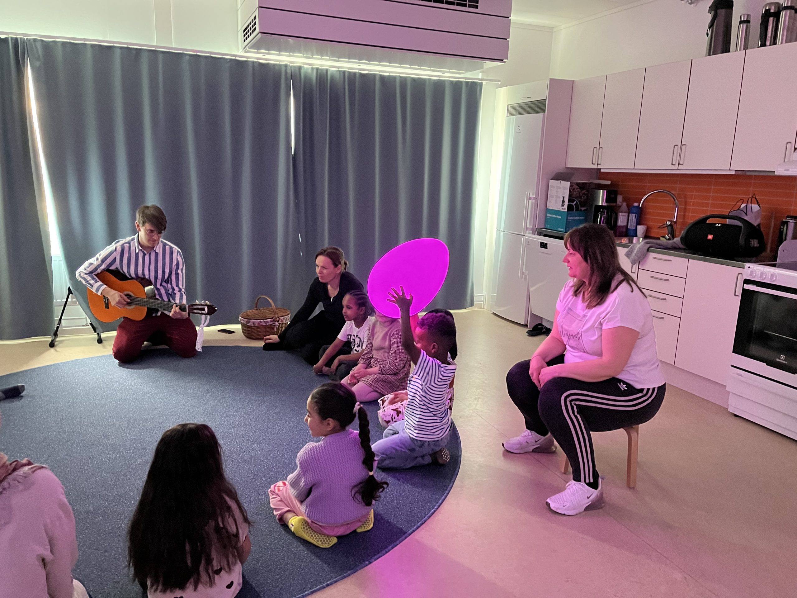På Trädgårdsgärdets förskola var musikpedagogen Filip Bagewitz ansvarig. Efter att barnen, som var mellan 5 och 6 år, krupit genom en vackert dekorerad ring, samlades de i en cirkel på golvet och fick sjungande säga sitt namn och hälsa på varandra. Filip använde både gitarr och trumma, och barnen fick maracas för att sjunga och träna på både gamla barnsånger och nya ramsor. En höjdpunkt var när Filip satte på låten Bara Bada Bastu, och alla studsade upp och lekte tafatt. Ingen kunde sitta still, och barnen sjöng för full hals. Till sist var det dags för en stilla stund, då ett självlysande jätteägg överlämnades från ett barn till ett annat under tystnad. Ingen ville sluta när musikstunden var över, så det blev några sånger till på övertid.